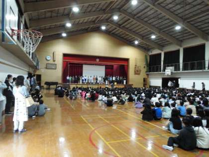 今日は1時間目から体育館に全校集まって、朝会と児童集会がありました。