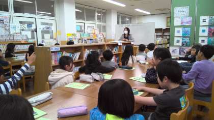 図書館司書の谷川先生に本の分類などについて聞いた後、分類クイズにもチャレンジしました。最後には去年の3年生の人気本ランキングも聞きました。
