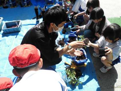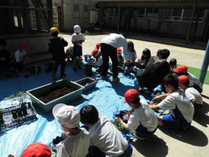 生活科「ぐんぐんそだてみんなのやさい」の学習で、ミニトマトの苗を植えました。