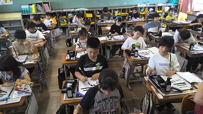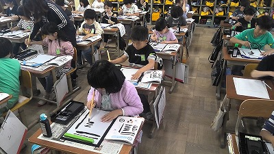 今週は毛筆デビューです。自分の習字セットを嬉しそうに抱えて登校してきました。準備は前もって学んでいたので、どの子もテキパキと準備できていました。あいさつをして、いよいよすずりに墨液を出したら、わくわくした表情が見られました。いつもの硬筆より少し良い姿勢で、いろいろな筆の動きを確かめました。片付けも手順を確かめながらしっかりとできました。次回からはいよいよ文字に挑戦します。きょうの宿題は、筆を丁寧に洗って、乾かしておくことです。来週の毛筆学習が楽しみですね!きょうも新たなチャレンジができました!