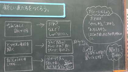 3年になって1か月がたちました。たくさんの友だちができた子も、まだまだ友だちがほしいなと思っている子もいると思います。またここでもう一度、新たな友だちの輪を広げてもらおうと、友だちになりたい子への声のかけ方などをみんなで考えました。「きゅうになれなれしく声をかけられたらびっくりするよ」や「名前を先に教えてくれたら、自分も名前を言いやすいね」という声が聞かれました。また好きなスポーツを聞きたかったら、どんな聞き方があるかなという発問に対して、「何の習い事してる?」や「昨日の日本代表のサッカー見た?」などと聞けるということに気付いていました。今の友だちも大切にしながら、またすてきな友だちが見つかるといいですね。