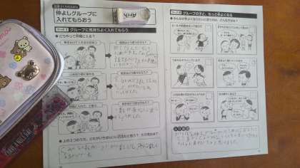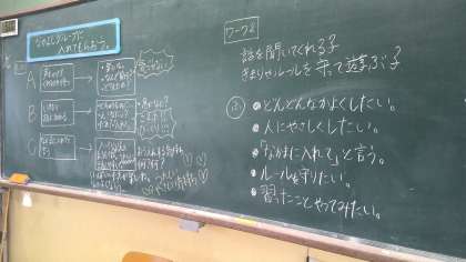 現在できている友だちグループに入れてほしいとき、どうやって入ったらいいのかな。話しかけてもらえるまで待つのがいいのか、急に会話に入るのがいいのか、「入れて〜」と言ってはいるのがいいのか、学活の時間に考えました。また仲の良くなった友だちとの関わり方についても話し合いました。「今度やってみる!」と前向きな姿が見られました。