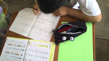 音楽の時間に「まとまりのあるリズムをつくろう」と音楽づくりをしました。「くり返し」や「変化」などを上手に使っていろいろなリズムができました。できたリズムを自分で「タン」で歌ったり、手拍子でたたいてみたりと楽しそうにチャレンジしていました。「お〜、いい感じで終わった!」や「もう少し変えてみたいなぁ〜。」ととても楽しそうでした。