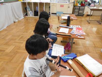 「ロンドン橋」を歌いながら、歌あそびをしました。「もう1回たい。」とリクエストがあり、3回楽しみました。「メリーさんのひつじ」は、リコーダーと鍵盤ハーモニカのグループに分かれて練習しました。指づかいに慣れて、曲の終わりまで演奏することができました。