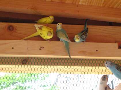 色とりどりのセキセイインコが20羽,鳥小屋に放されると ところせましと