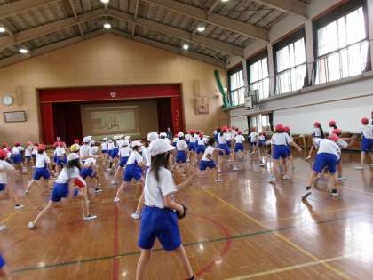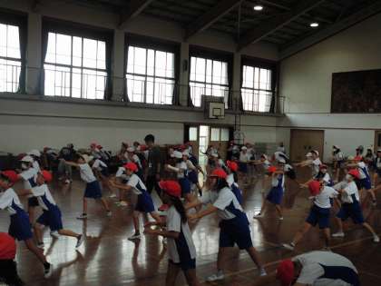 本格的にソーラン節の練習を体育館で始めました。教室では動きが小さかったのですが、体育館ではのびのびと踊っています。腰を低く、膝を使う、声を出すなど、たくさん気を付けるポイントがありますが、細かい動きにも気を付けられるようになってきました。日に日に上手になってきています。心を一つに踊れるよう、練習をがんばっています。