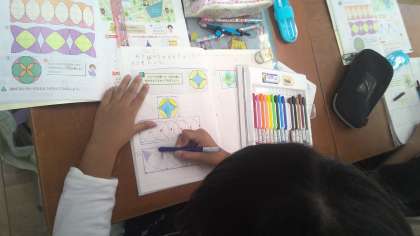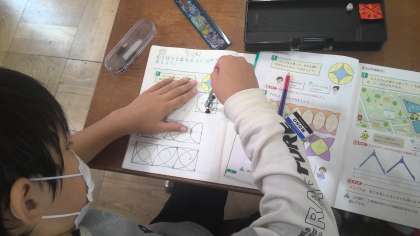 コンパスで円を描くのが楽しくなってきました。きょうはもようづくりに挑戦です。教科書のお手本から円の中心を予想して、ノートに描いていきます。「今度は自分でオリジナルのもようをつくりたいな」という声も聞こえてきました。