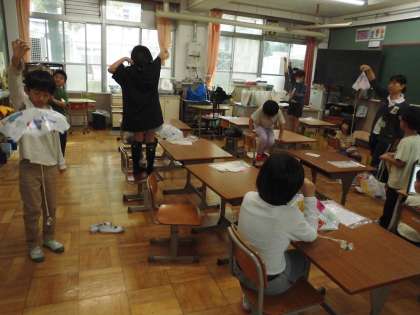 その後は、お楽しみのパラシュートを落下させて遊びました。パラシュートの落下していく動きがおもしろく夢中になって何度も楽しんでいました。