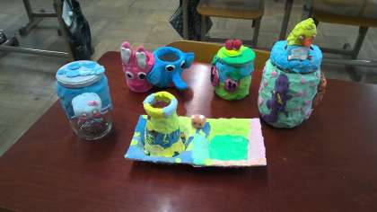図工「空きようきのへんしん」の学習で粘土をしました。家から持って来た空き容器を利用して、思い思いの作品を作っていました。完成したので、次回はみんなで鑑賞します。