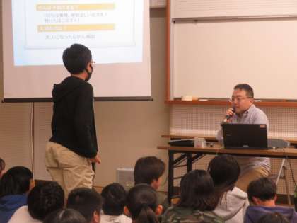 今日は京都医療センターの先生と、がん教育推進メッセンジャーの方が来てくださり、子ども達にがんの話をしてくださいました。身近によく聞くがんのことですが、実際にはあまり詳しく知らないこともたくさんあり、予防すること、検査を受けることがとても大切だと教えていただきました。後半は、がん経験者の方からお話を聞き、周りで支えてくれる人の大切さについても知ることができました。これから今日のお話を受けて子ども達が意識して生活してくれると嬉しいです。またぜひお家でもお話を聞いてみてください。