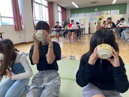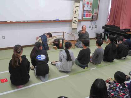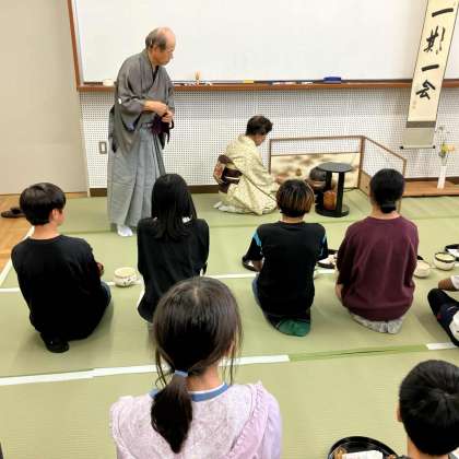 昨日、今日と茶道の体験活動を行いました。初めて茶道をする子ども達が多く、どんなことをするのか始まる前からとても楽しみにしていました。畳の上での歩き方、掛け軸や花の拝見の仕方も教えていただきました。お抹茶を実際に自分でたててお菓子と一緒にいただくと、「おいしい。」「もっと飲みたい。」という声も聞こえてきました。普段なかなかできない体験をし、社会科や総合的な学習でも日本の文化について調べていたので、子ども達はより日本文化の素晴らしさについて知る機会になったと思います。またぜひお家でもお話を聞いてみてください。