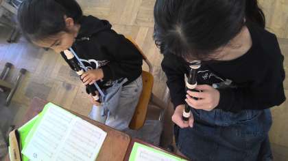 楽しくリコーダーの練習をしています。上のパート、下のパートに分かれ演奏にチャレンジしています。休み時間には、近くにいた友だちに「一緒に演奏しよう」「ぼく上パートをやるから、だれか下パートできる人?」などと声が聞こえています。うっとりするような演奏がいろんなところから聴こえています。芸術の秋☆彡