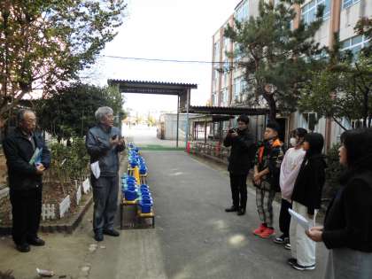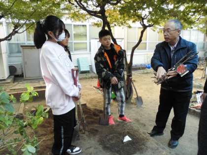 学校を代表して6年生児童3名が中庭に植樹をしました。