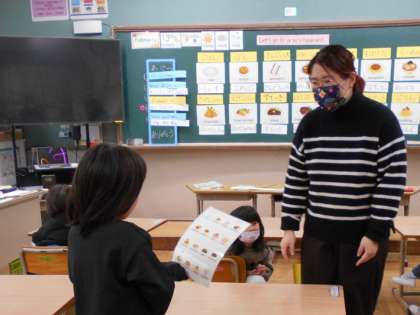 「レストランへ行こう」の学習では、食べ物を英語で発音したり、レストランで食べ物を注文したりする練習をしています。2月13日(木)は、ALTのカレン先生と一緒に学習しました。発音練習の後、レストランの店員役のカレン先生に食べ物を注文する練習をしました。今年度最後のカレン先生との学習だったので、学習後にみんなで記念写真を撮りました。