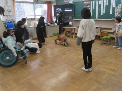 2月12日(水)は、ジャコウウシのちえを読みました。ジャコウウシの大人たちは、敵がやってくると、子どもの周りに集まって輪になり、つのを外に向けます。このようにして、子どもを敵から守ります。大人と子どものジャコウウシ役を決めて、動作のまねをしながら、読み進めました。