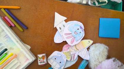 きょうは魚を作りました。ダイオウイカやチンアナゴなど楽しい海の生き物がそろいました。あしたの魚釣り大会が楽しみですね。