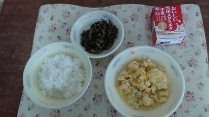 今日の献立は、ごはん・牛乳・ふっくらだしたまご・ひじきの煮つけ