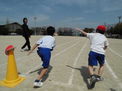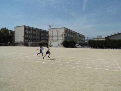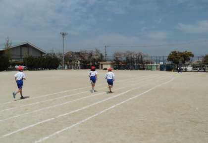 体育で50m走のタイムを計りました。今日はとてもいい天気で、みんなも全力で走っていました。待っているときは、走っている友だちの応援を頑張りました。