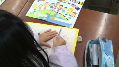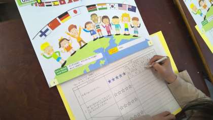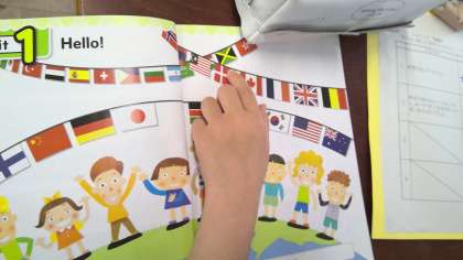 今日から外国語活動の学習が始まりました。きょうは世界のあいさつをたくさん知りました。楽しそうにくり返し言ってみる姿が見られました。画用紙に名前を書いて、ワークシートも貼り、ノートが完成しました。ケニアの人がいたら「ジャンボ!」って声をかけてみたいですね☆