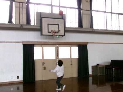大きなバスケットボールを勢いよくシュートし、