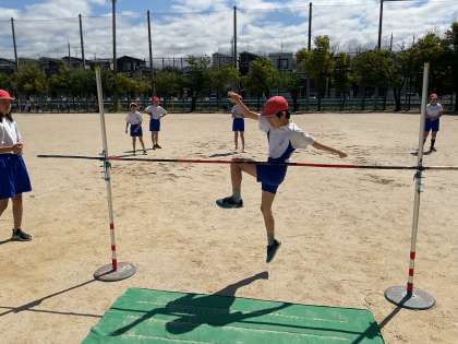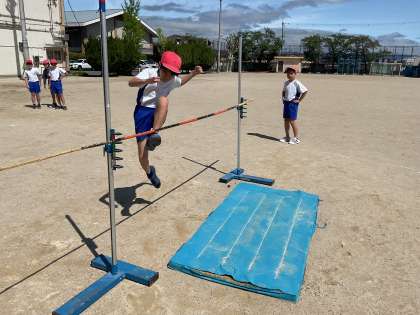 リズミカルな助走や跳ぶ時の足に注意して目標の高さに挑戦していました。