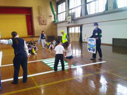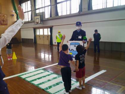右・左・後ろの確認や、横断歩道は手を挙げて渡るなど、教えていただいたことを実践しました。車役のサポートの方もおられて、普段の生活さながらの交通安全教室でした。