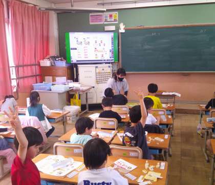 『かずとすうじ』では数図ブロックを動かしたり、手の指の数を動かしたりして数を数えました。またタンバリンの何回音がなったでしょうクイズは、静かに集中して音の数を聞いて数図ブロックを動かしました。