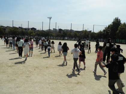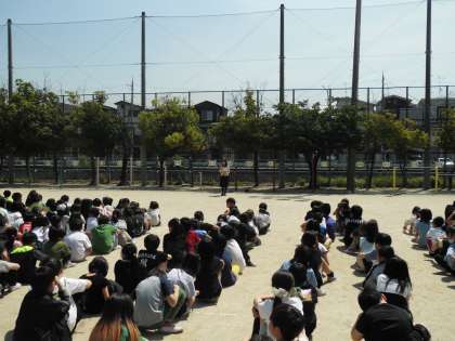 そして、地震がおさまったことを確認後、放送の指示に従い「お・は・し・も・て」を守りながら運動場に避難しました。