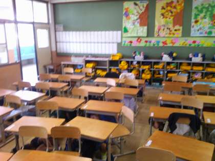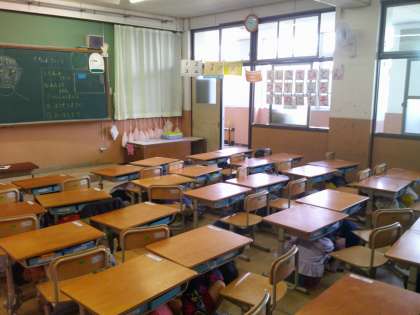 机の下に入り、頭を隠して、机の脚をもつんだよと伝えると、はじめてとは思えないほど静かに行動し、避難するときも「お・は・し・も・て」を実践してくれました。