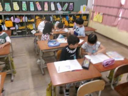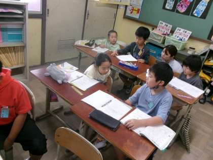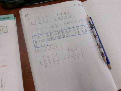 3けたのたし算とひき算の筆算をしばらく学習してきました。今日は4けたの数の筆算を学習しました。4けたでも今までと同じように計算ができるということに気がつきました。自分の考えや計算の仕方を隣の人に伝え合いました。