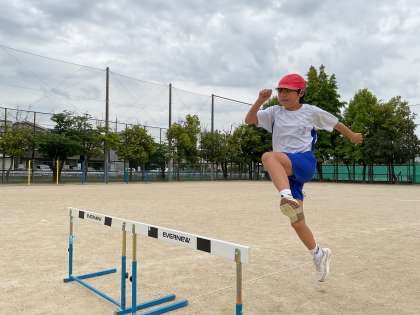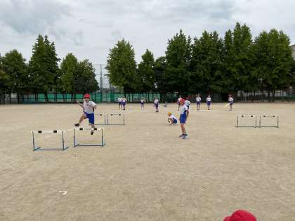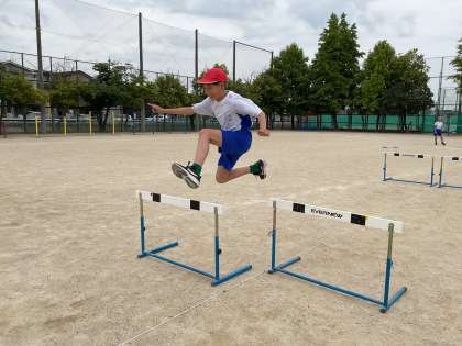 体育の学習で「ハードル走」をしています。さらによいタイムをだすためにハードルを跳び越す時の姿勢やインターバルを見つけていました。