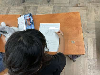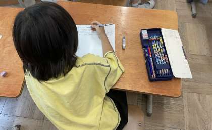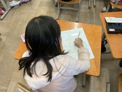 今回の生活の学習では、町探検したことを振り返り、カードに書きました。
