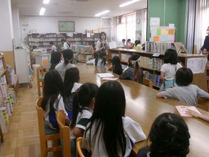 今月はあじさい読書月間です。6日(金)の中間休みに図書館で司書の先生による読み聞かせがありました。「ランパンパン」と手拍子を打ちながら楽しくお話を聞いていました。
