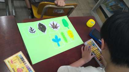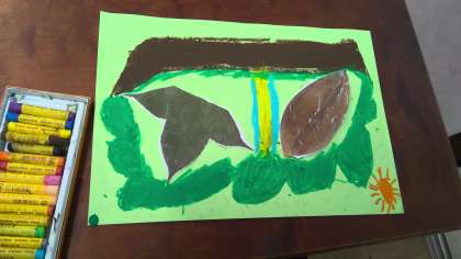 お気に入り葉を色画用紙に貼って、それを利用してクレパスで絵を描きました。