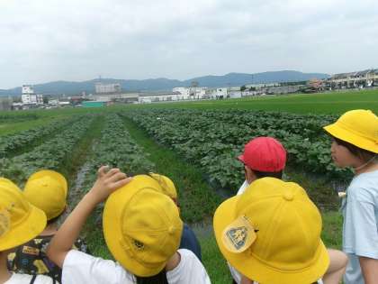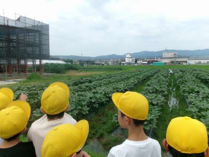 社会「農家でつくられるもの」の学習の一環で、地域で京おくらを育てている方の畑へ見学に行きました。おくらには花が咲いていて、実もつき出していました。京おくらの作り方や農家の方の思いなどを調べていきたいと思います。