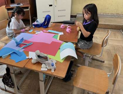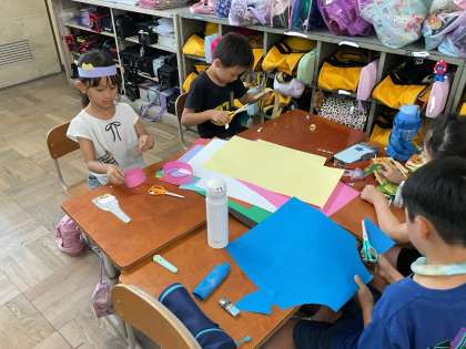 今回の図工では、画用紙を使ってわっかをたくさん作り、変身しました。