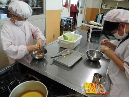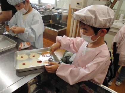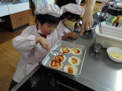 とうもろこしは、湯がいてから粒をとりました。ピザづくりでは、餃子の皮にケチャップを塗って具材をのせました。みんな真剣な表情で、料理を作っていました。