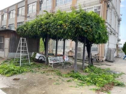 地域の羽束師ジュニアの指導をされている高橋監督が、運動場近くの藤棚の剪定と側溝の掃除をしていただきました。日頃から本校の環境整備にご尽力いただいております。羽束師小学校を大切にしてくださっていることに感謝いたします。