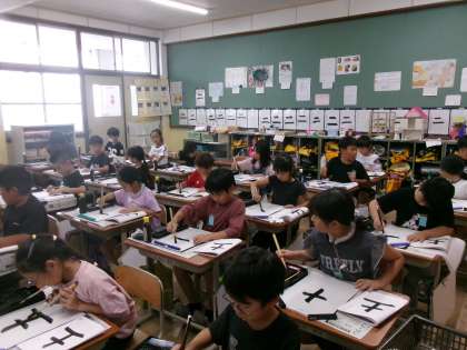 たて画に気を付けて、毛筆で『土』をお手本をよく見て書きました。集中して書くことができました。準備や後片付けなど、1学期の学習を思い出しながらしました。