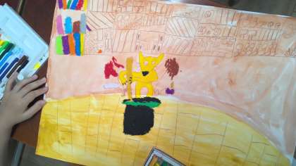 図工「ことばから思いうかべて」の学習で、聞いた物語から情景を思い浮かべて絵を描いています。
