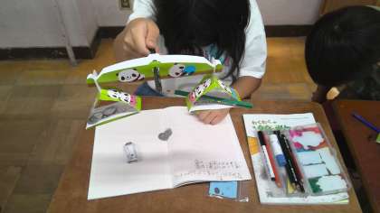 教科書についているてんびんを使って、1円玉で重さを測りました。