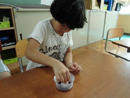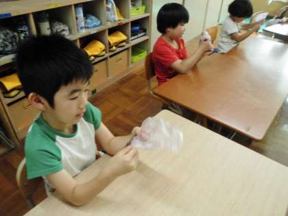 ひまわりの1年生も春からアサガオを育ててきました。とても暑かった夏休みでしたが、お家の方のご協力で枯れずに過ごすことができ、2学期になって花びらを毎日集めました。集めた花びらをもんで色水を作り、和紙を染めました。折り方や色水の量によって模様の出方が変わります。子どもたちは、わくわくした表情で和紙を広げ、きれいな模様を見てとても嬉しそうでした。