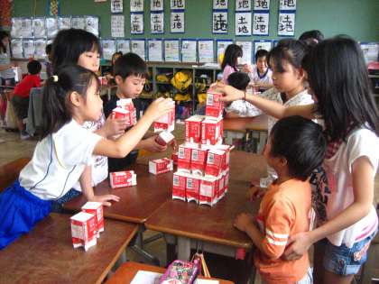 次に,『つみパック』というゲームをしました。自分の名前を言ってから,1人1つずつ牛乳パックを積んでいきます。