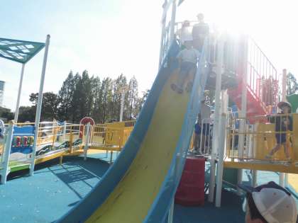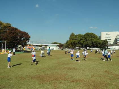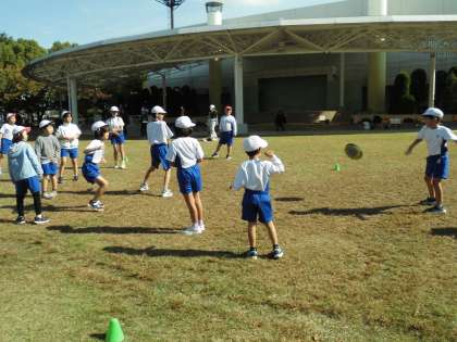 合同運動会のあと、お弁当を食べて、午後は3校交流会をしました。3つのグループに分かれてドッチビーをしました。その後、学校対抗のしっぽ取りををしました。最後に遊具遊びを楽しみました。友だちの名前もだいぶ覚えて、「〇〇くん、あたった!」や「〇〇さん、はやい〜」など、仲良く遊んでいました。