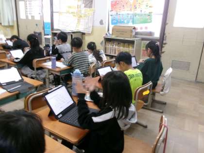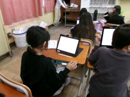 タブレットを使いながら、おまつりの音楽に合ったリズムを作っていました。