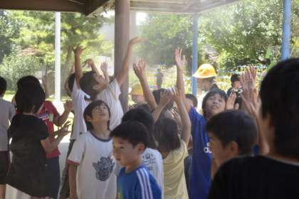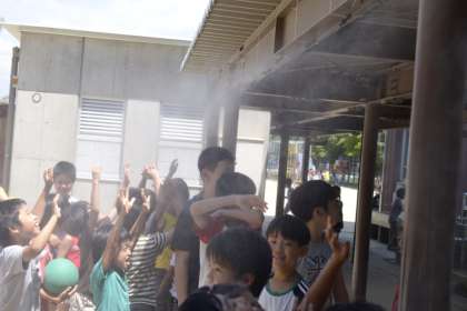 運動場の出入り口にミストが設置されました。子どもたちはもう大興奮です。