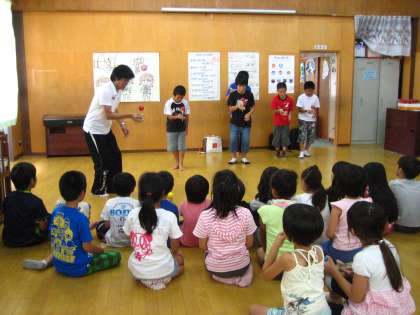 児童館の子どもたちの前で いろいろな難しい技を披露すると「すご〜い!」という歓声があがっていました。その後は,個別レッスン。6年生のお兄さん・お姉さんに教えてもらって,児童館の子どもたちは一生懸命練習に励んでいました。
