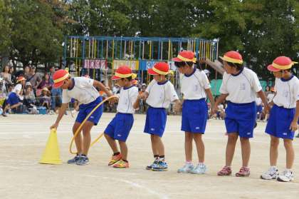 1年生から6年生まで,上手にフープをくぐりぬけ,コーンにフープをかけたらダッシュ!