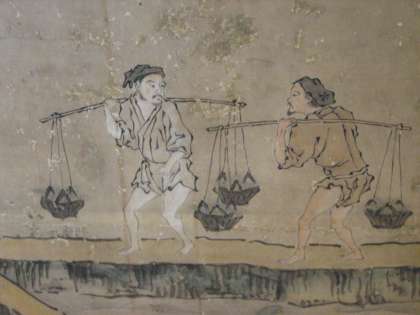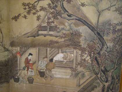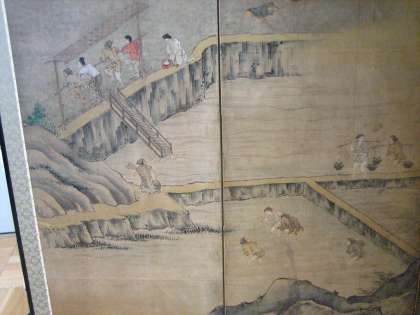 屏風を近くで見ると,昔の人々のくらしの様子が繊細に描かれています。