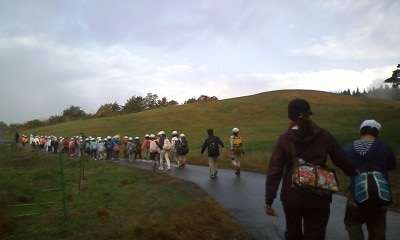 奥越の宿泊学習二日目です。目を覚ますと外は雨。ハイキングは無理かと思いきや、雨も上がり元気に出発です。雨具もちゃんと用意し、熊除けのための鈴をつけて元気に歩いています。鈴の音が紅葉につつまれた高原にかろやかに響いています。このままお天気がもちますように・・・
